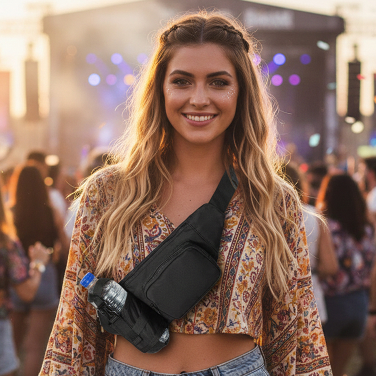 Deze bottle bag fanny pack is de ideale combinatie van gemak en functionaliteit voor festivals, vakanties en dagelijkse uitstapjes. Dankzij de geïntegreerde fleshouder neem je eenvoudig een drinkfles mee, zodat je altijd voldoende water bij de hand hebt zonder een rugzak te hoeven dragen. Perfect voor lange festivaldagen, stedentrips of wandelingen.
