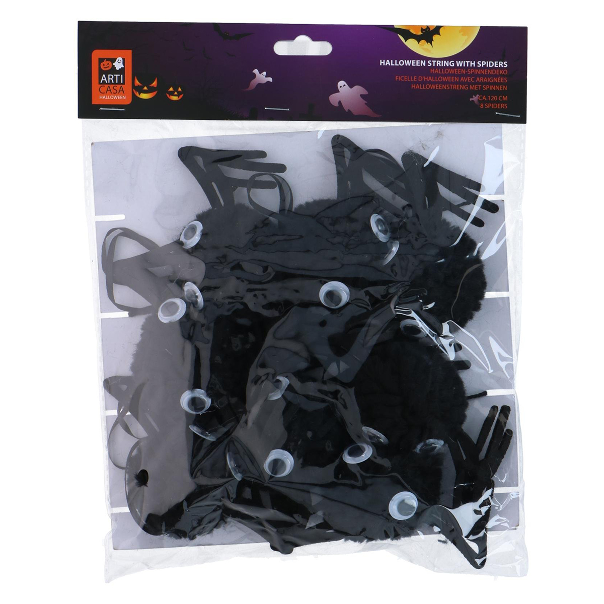 Breng direct griezelige sfeer in huis met deze Halloween slinger met hangende spinnen! De 120 cm lange slinger met acht pluizige zwarte spinnen met wiebeloogjes zorgt voor een spookachtig accent aan muur, deur of trap. Perfect voor Halloweenfeesten, thema-avonden of kinderfeestjes, eenvoudig op te hangen en elk jaar opnieuw te gebruiken!