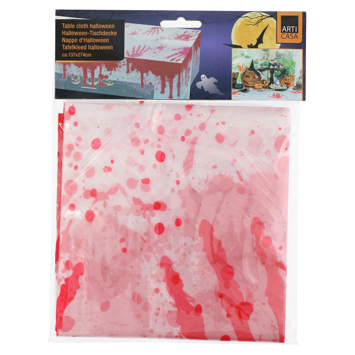Maak jouw Halloween-decoratie compleet met dit enge Halloween tafelkleed met bloedspatten en bloederige handen! Met zijn afmetingen van 274 x 137 cm is dit tafelkleed groot genoeg om de meeste tafels volledig te bedekken en direct een griezelige uitstraling te geven. De levensechte rode handafdrukken en bloedspatten zorgen voor een huiveringwekkend effect dat perfect past bij Halloweenfeesten, horroravonden of enge filmavonden. Gemaakt van stevig kunststof, is dit tafelkleed niet alleen praktisch, maar ook eenvoudig schoon te maken met een vochtige doek. Dankzij het lichte materiaal is het gemakkelijk te plaatsen, te verwijderen en opnieuw te gebruiken bij volgende feestjes. Combineer dit bloedige tafelkleed met andere Halloween-decoraties zoals spinnenwebben, pompoenen, nepbloed of schedels voor een compleet en angstaanjagend thema. Of je nu een intiem Halloween-diner organiseert of een groots griezelfeest, dit tafelkleed zorgt gegarandeerd voor de juiste sfeer. Gasten zullen direct onder de indruk zijn van jouw oog voor detail en misschien zelfs even schrikken van de realistische bloedsporen!