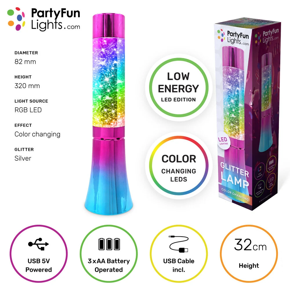 Deze multicolor glitter lavalamp is een echte blikvanger en combineert iconisch retro design met moderne kleurveranderende verlichting. Zodra je de lamp inschakelt, beginnen de zilveren glitters langzaam te bewegen in het glazen reservoir, terwijl de ingebouwde multicolor LED-verlichting continu van kleur verandert. Dit zorgt voor een rustgevend, hypnotiserend en sfeervol effect dat perfect is als sfeerverlichting, nachtlamp of decoratie.