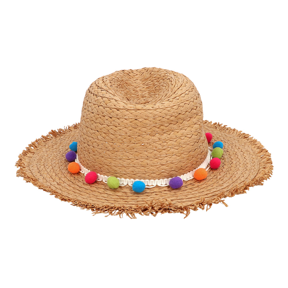 Met zijn natuurlijke uitstraling en speelse afwerking is deze zomerhoed met pompons ideaal voor iedereen die houdt van een relaxte, kleurrijke en trendy stijl. Een leuk accessoire dat moeiteloos sfeer toevoegt aan iedere zomerse outfit.