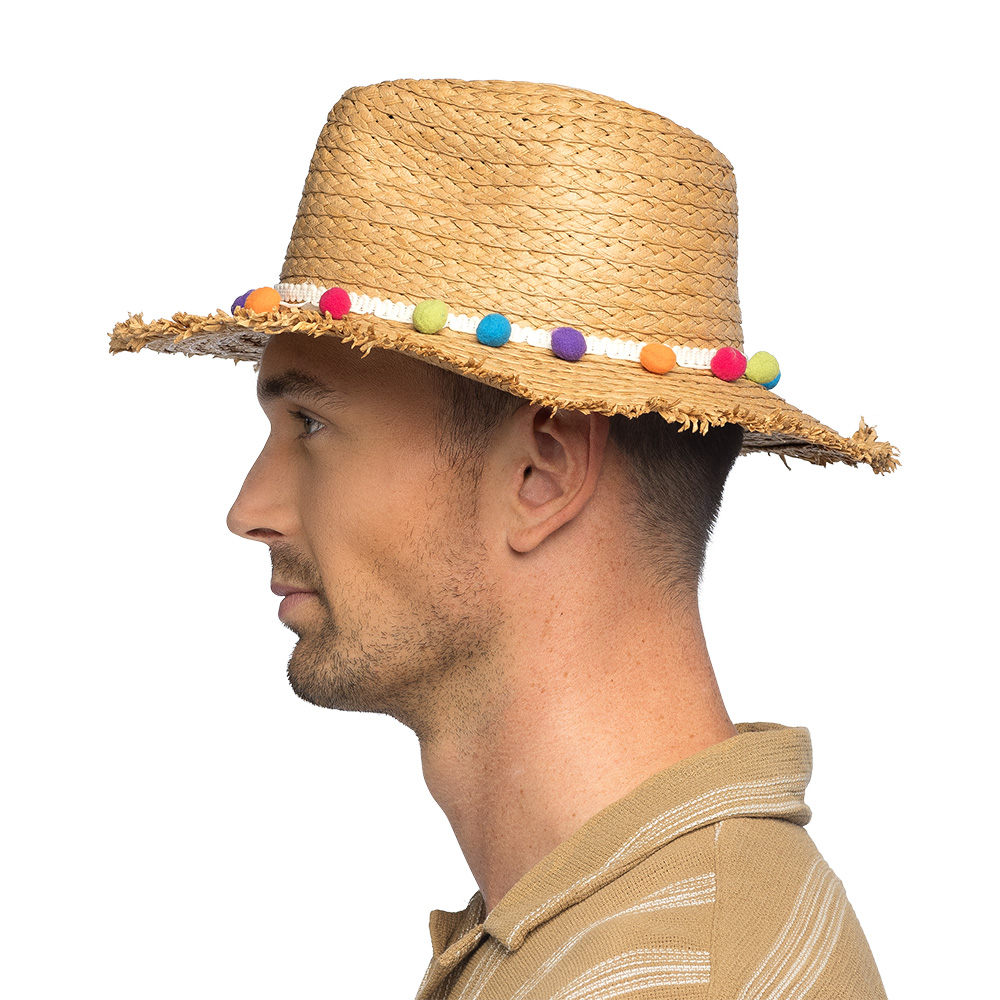 De echte blikvanger van deze boho hoed is de sierrand met gekleurde pompons. Deze vrolijke details zorgen voor een speels accent en geven de hoed een unieke, feestelijke uitstraling. Daardoor past dit accessoire perfect bij bohemian fashion, kleurrijke festival outfits en zomerse partylooks. De combinatie van stro en pompons geeft de hoed een nonchalante, trendy en zomerse vibe.