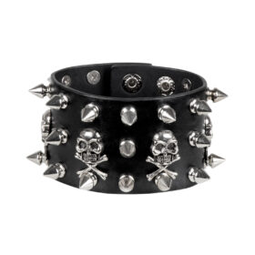 Geef je outfit direct een stoere en opvallende uitstraling met deze biker armband met spikes. De zwarte lederlook band is afgewerkt met zilveren spikes en doodskoppen voor een krachtige punk- en rockstijl. De armband is gemaakt van 55% metaal en 45% polyurethaan, heeft een drukknoopsluiting en is verstelbaar in maat. Perfect voor festivals, themafeesten, carnaval of een edgy everyday look. Een echte blikvanger voor liefhebbers van een stoer accessoire.