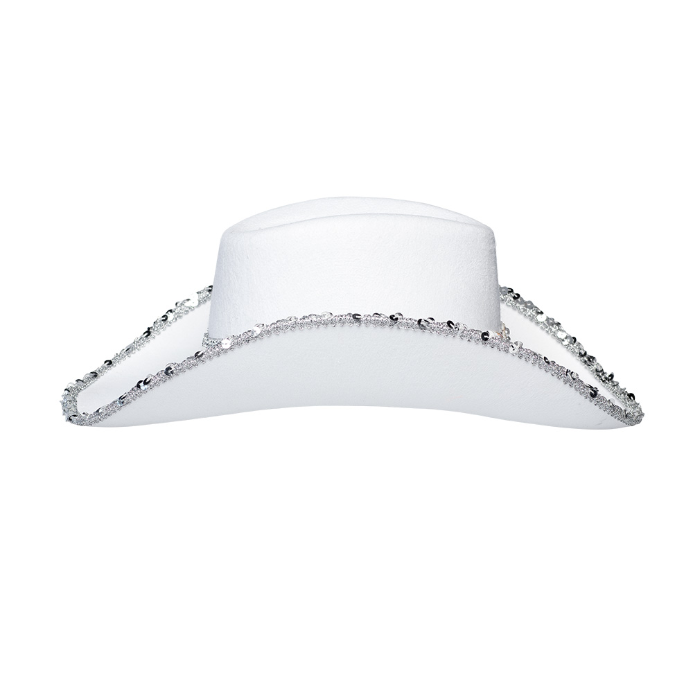 Met een hoofdomtrek van 59 cm heeft deze witte cowboyhoed een prettige pasvorm. De combinatie van de witte basis en de glinsterende accenten maakt de hoed eenvoudig te combineren met allerlei feestlooks, van een casual outfit tot een complete bride party styling. Draag hem bij een witte jurk, denim, roze accessoires of een opvallende party outfit en maak de bridal look helemaal af.