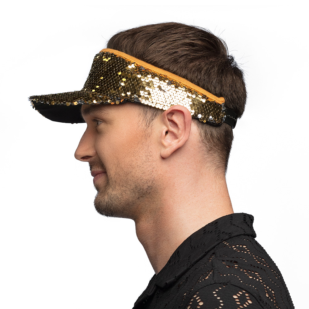Met zijn sprankelende uitstraling, verstelbare pasvorm en speelse paillettendesign is deze gouden zonneklep een must-have voor iedereen die houdt van opvallende feestaccessoires. Een vrolijke en trendy toevoeging aan iedere feestgarderobe!