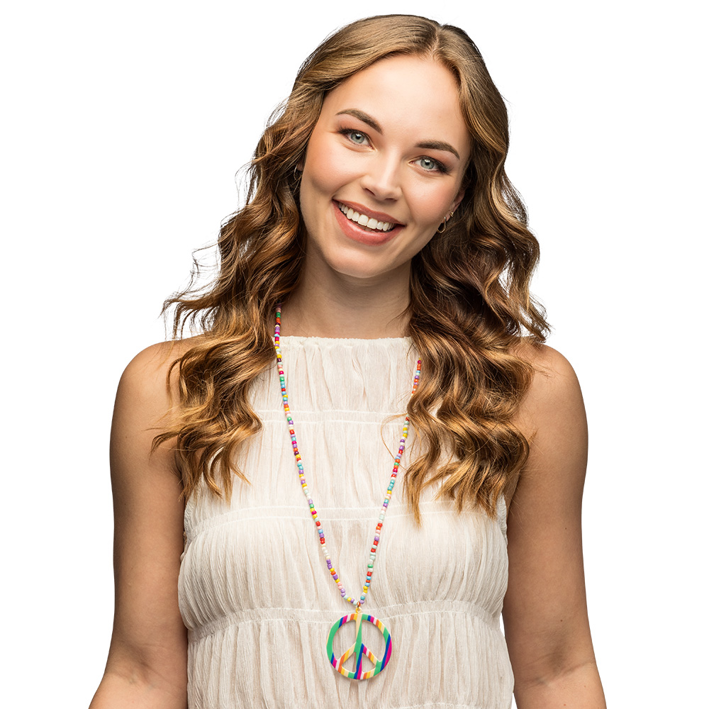 De combinatie van de bonte kralen en het herkenbare peace teken geeft deze ketting een echte hippie vibe. Daardoor is dit accessoire ideaal voor een festival outfit, themafeest, carnaval of een foute party. Ook bij een 60’s of 70’s look komt deze ketting perfect tot zijn recht. Draag hem als opvallend detail of als finishing touch bij een complete verkleedoutfit.