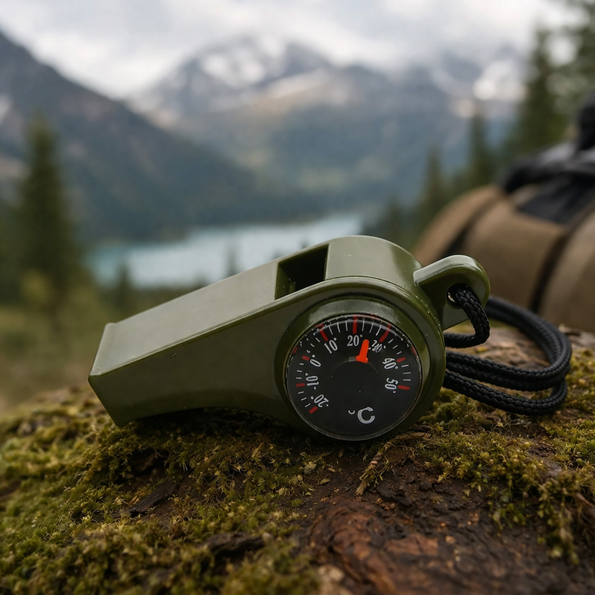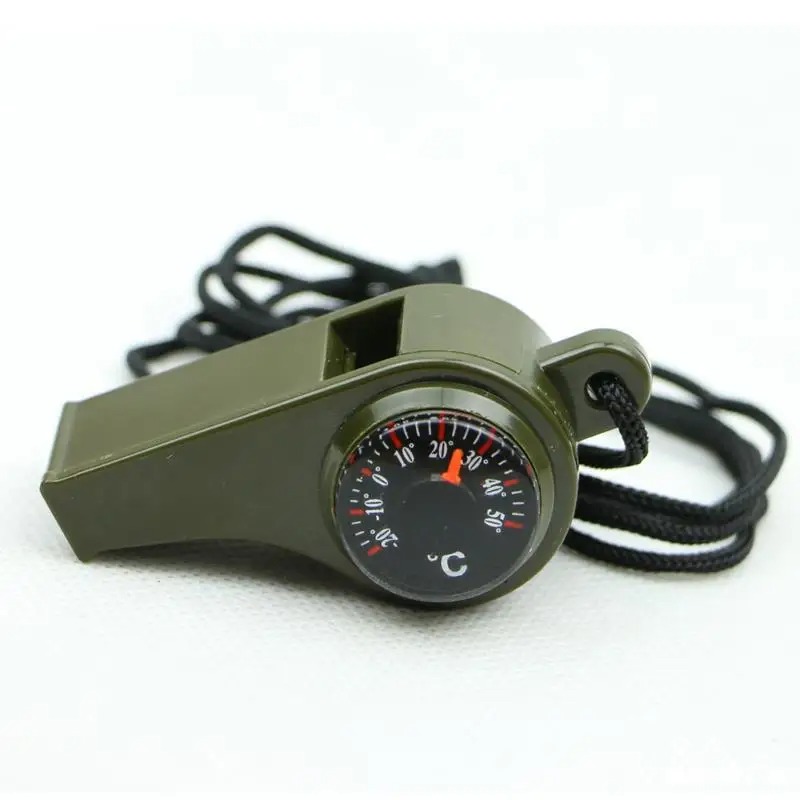 Multifunctioneel Noodfluitje 3-in-1 – Fluitje, Kompas & Thermometer – Outdoor Survival – Legergroen