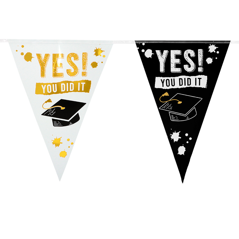 Het ontwerp combineert de tekst ‘Yes! You did it’ met een feestelijke doctoraalsmuts en stijlvolle accenten in zwart, wit en goud. Daardoor past deze afstudeer versiering perfect bij allerlei soorten geslaagd decoratie en is hij eenvoudig te combineren met ballonnen, slingers en andere feestartikelen. De kleuren geven de vlaggenlijn een feestelijke, maar ook nette uitstraling.