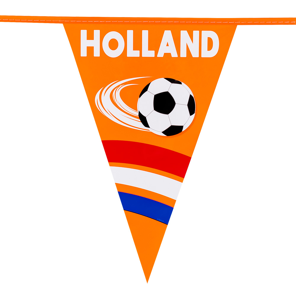 Toon jouw Nederlandse trots met deze Holland vlaggenlijn, dé must-have decoratie voor elke Oranjefan! Of je nu het Nederlands elftal aanmoedigt tijdens het EK of WK, of de straat versiert voor Koningsdag of Bevrijdingsdag, deze vlaggenlijn zorgt direct voor een feestelijke en patriottische sfeer. De vlaggenlijn bestaat uit 15 driehoekige vlaggetjes van 20 x 30 cm (B x H), bedrukt met een opvallende voetbalprint en de tekst “HOLLAND” in witte hoofdletters. De combinatie van oranje met rood-wit-blauwe accenten verwijst naar de kleuren van de Nederlandse vlag en brengt elke locatie in echte supportersstemming. Gemaakt van polyethyleen, is deze vlaggenlijn stevig, scheurvast en weerbestendig. Daardoor is hij ideaal voor binnen- en buitengebruik, of het nu in de tuin, op het balkon, in de straat of tijdens een sportevenement is. De vlaggen zijn aan één kant bedrukt, zodat de kleuren helder en opvallend blijven, zelfs bij langdurig gebruik of zonlicht. Met een lengte van 6 meter kun je eenvoudig grote oppervlakken versieren en de lijn meerdere keren gebruiken. Het lichte gewicht maakt het ophangen eenvoudig met touw, tape of klemmen, en na gebruik berg je hem snel weer op. Combineer deze vlaggenlijn met andere oranje feestartikelen, zoals ballonnen, toeters of hoeden, voor een complete Oranjesfeer tijdens elk feest of toernooi!